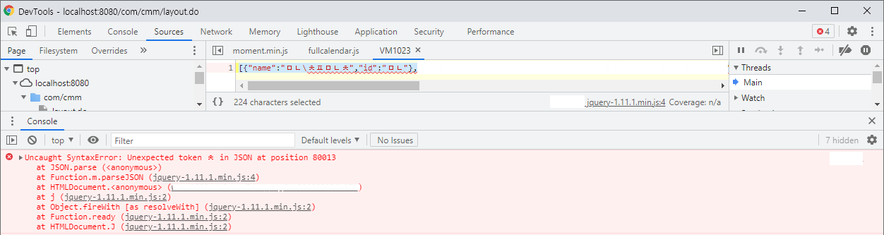 VM1042:1 Uncaught SyntaxError: Unexpected token ㅊ in JSON at position 13
