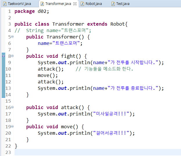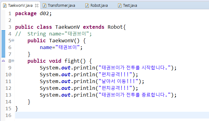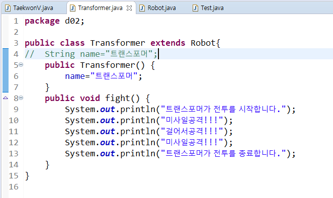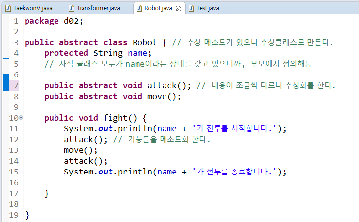 => fight()형태가 같아졌으니 부모에 그냥 정의를 해주고, 자식클래스에서는 지워버려도 된다.