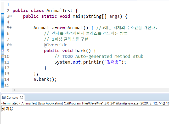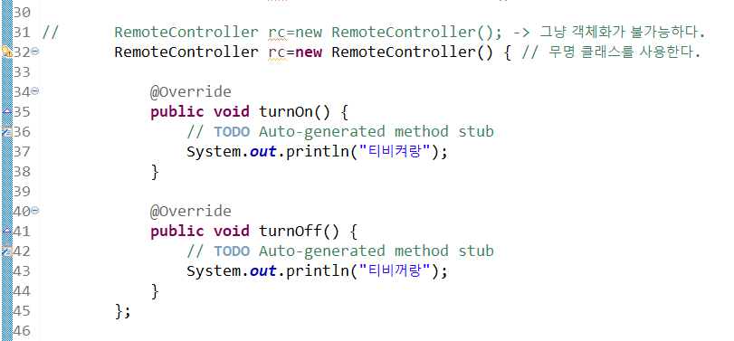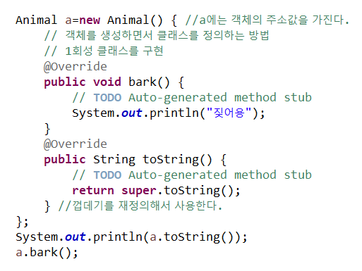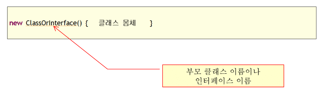무명 클래스 (anonymous class) : 클래스 몸체는 정의되지만 이름이 없는 클래스