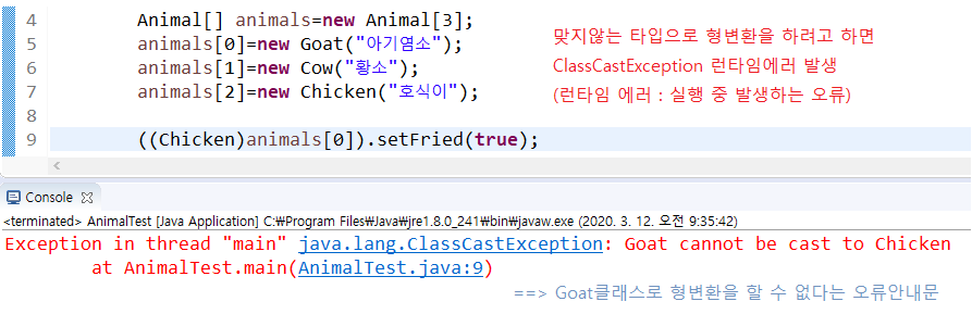 타입을 잘보고 형변환을 하지 않으면 런타임오류가 발생한다.