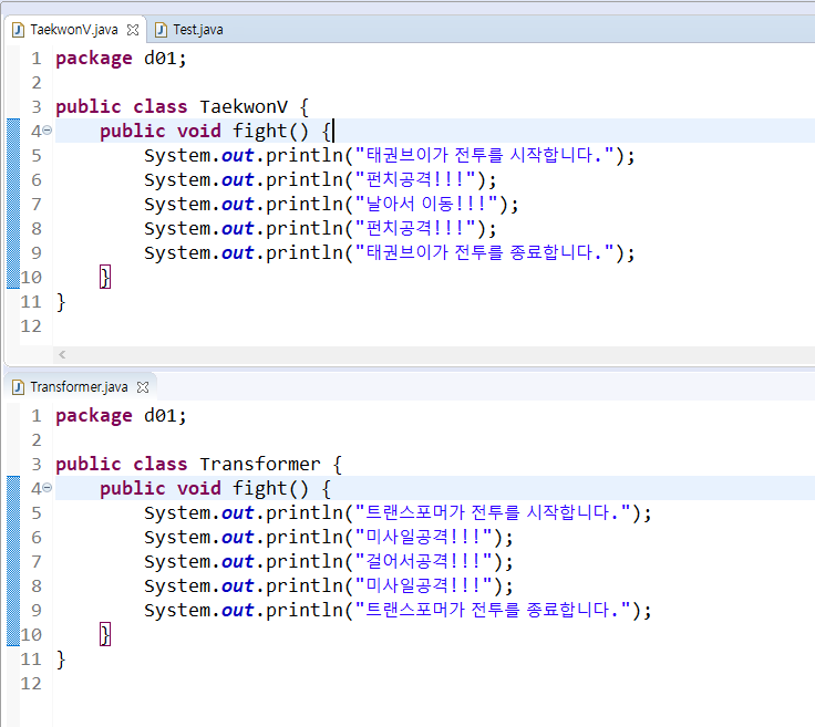 둘다 fight()라는 공통된 기능이 있다 => 부모 메소드를 만들어 사용한다.