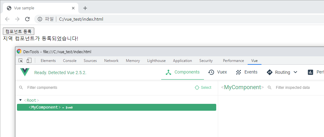<my-component> 태그를 넣은 곳에 '<div>전역 컴포넌트가 등록되었습니다!</div>'가 출력된걸 확인할 수 있다.