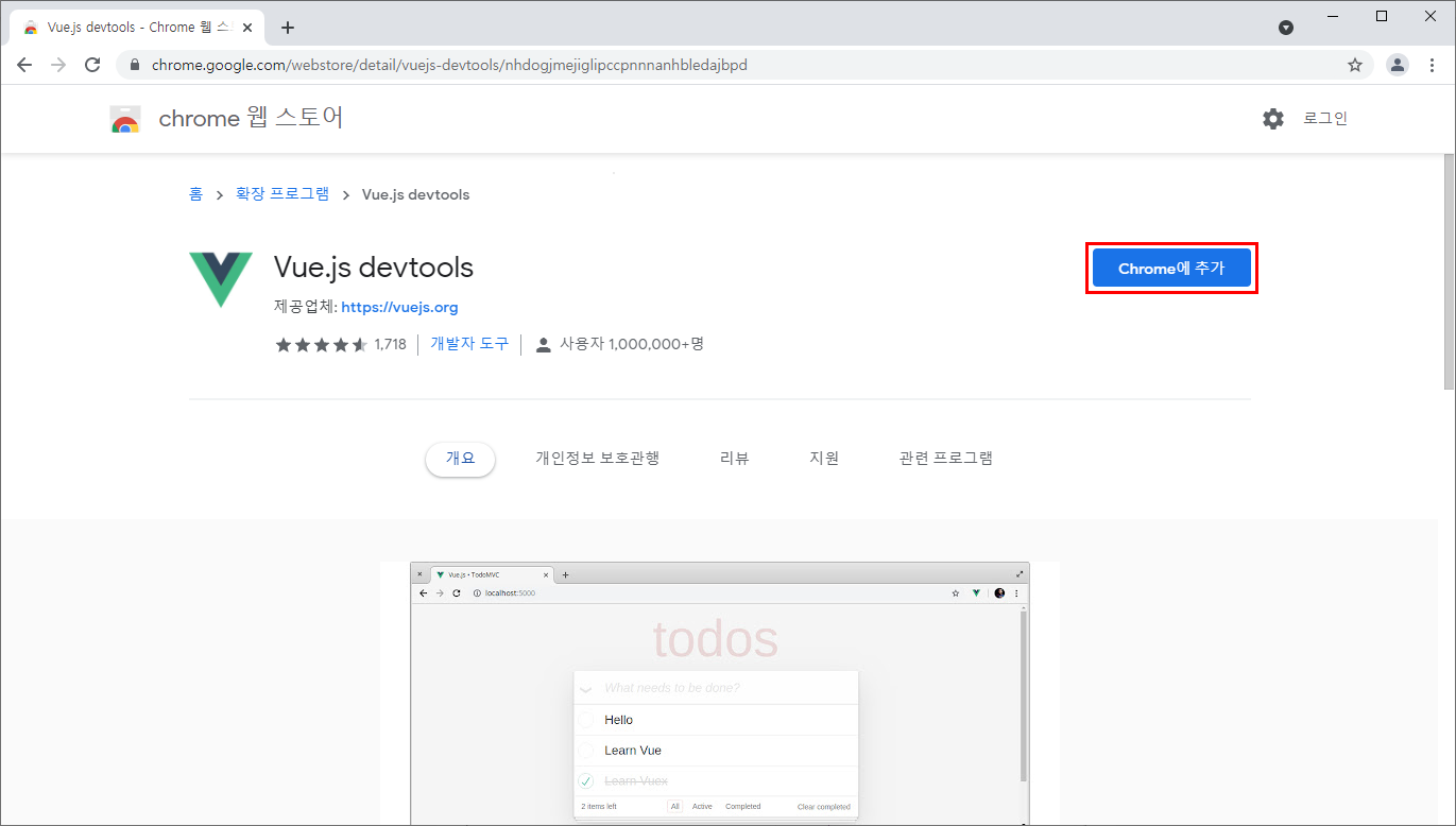 크롬을 사용할것이기 때문에 구글에 vue.js devtools를 검색해 Vue.js devtools를 설치한다.