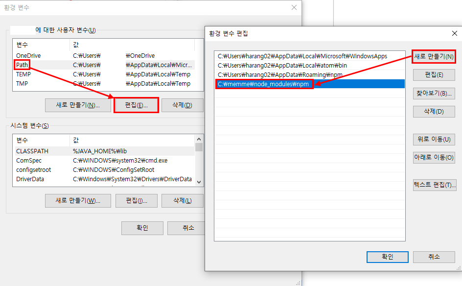 [제어판>시스템 및 보안>시스템] 또는 [내 PC 우클릭>속성] >고급 시스템 설정>환경변수>Path 더블클릭 또는 Path 선택후 편집>새로 만들기>Node.js 압축 풀었던 경로 입력>확인