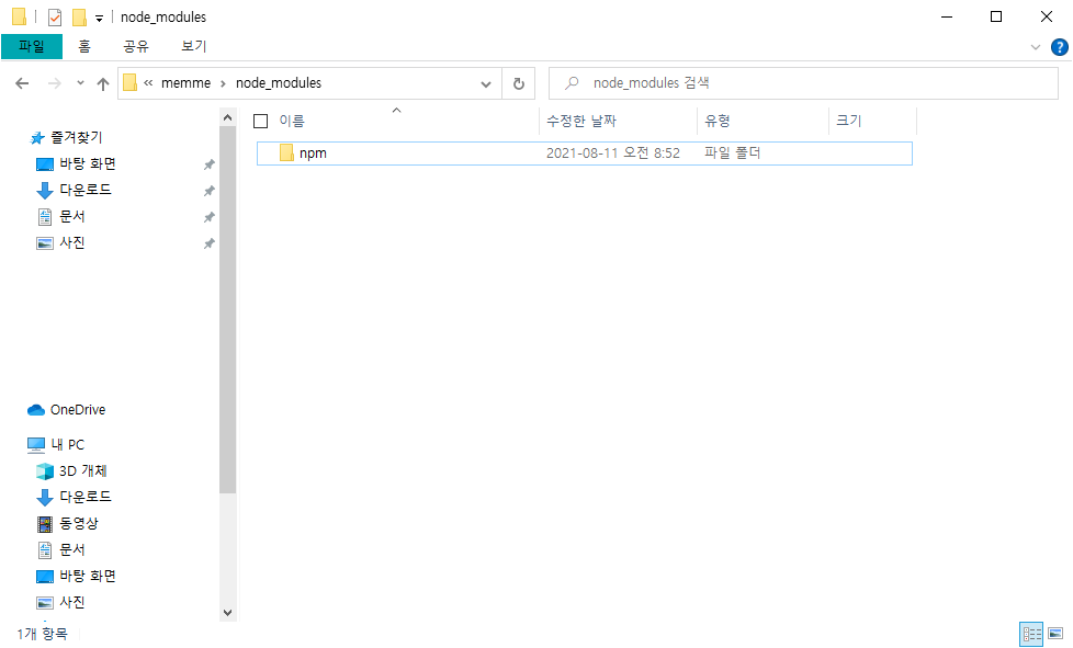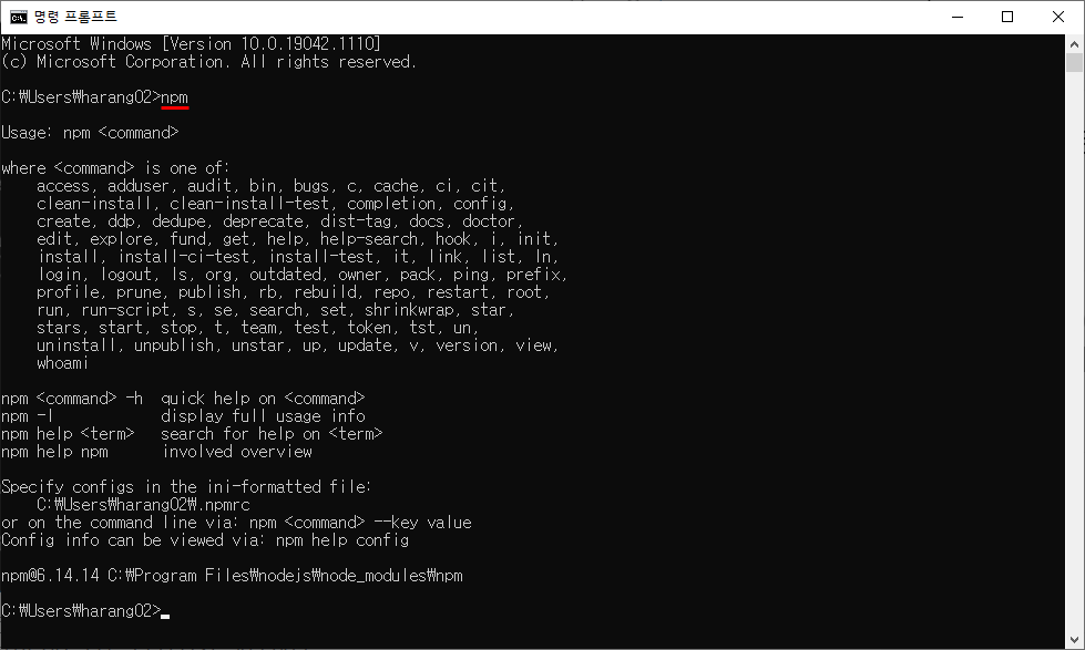 cmd 창에 npm을 쳤을 때 아래와 같이 나오면 정상적으로 설정된 것이다.