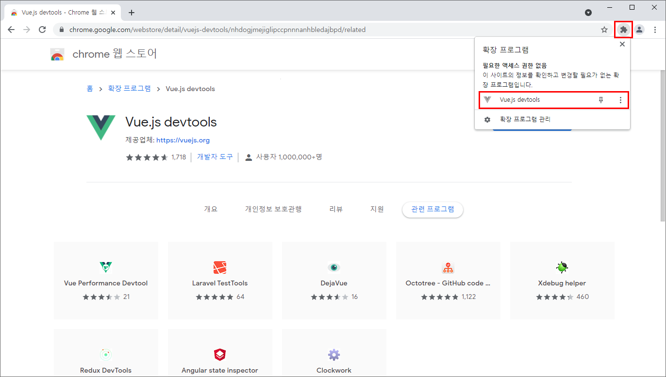 크롬 주소창 우측 확장 프로그램에 Vue.js devtools이 추가된걸 확인할 수 있다.
