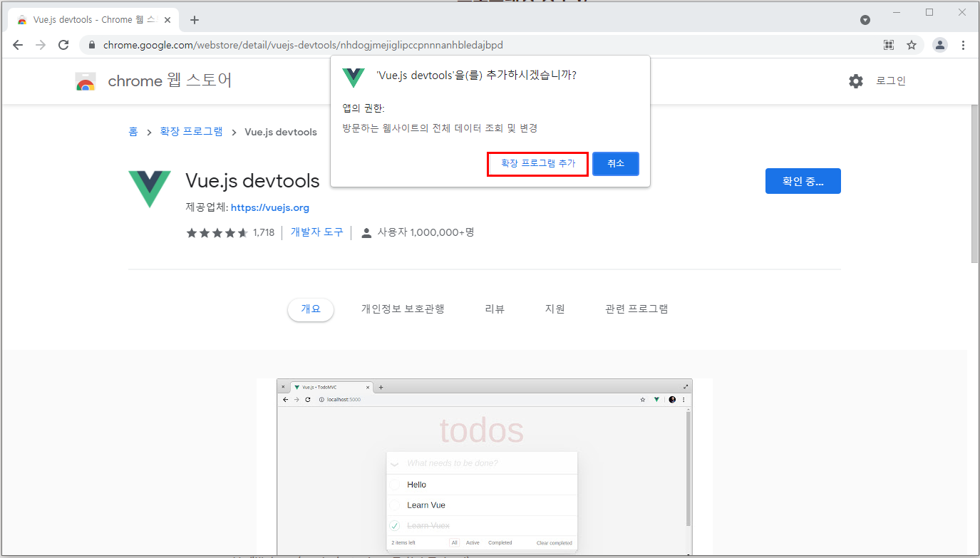 Chrome에 추가를 누르면 설치가 완료되고, " 'Vue.js devtools'을(를) 추가하시겠습니까? "라는 알림창이 뜬다. 확장 프로그램 추가를 누른다.