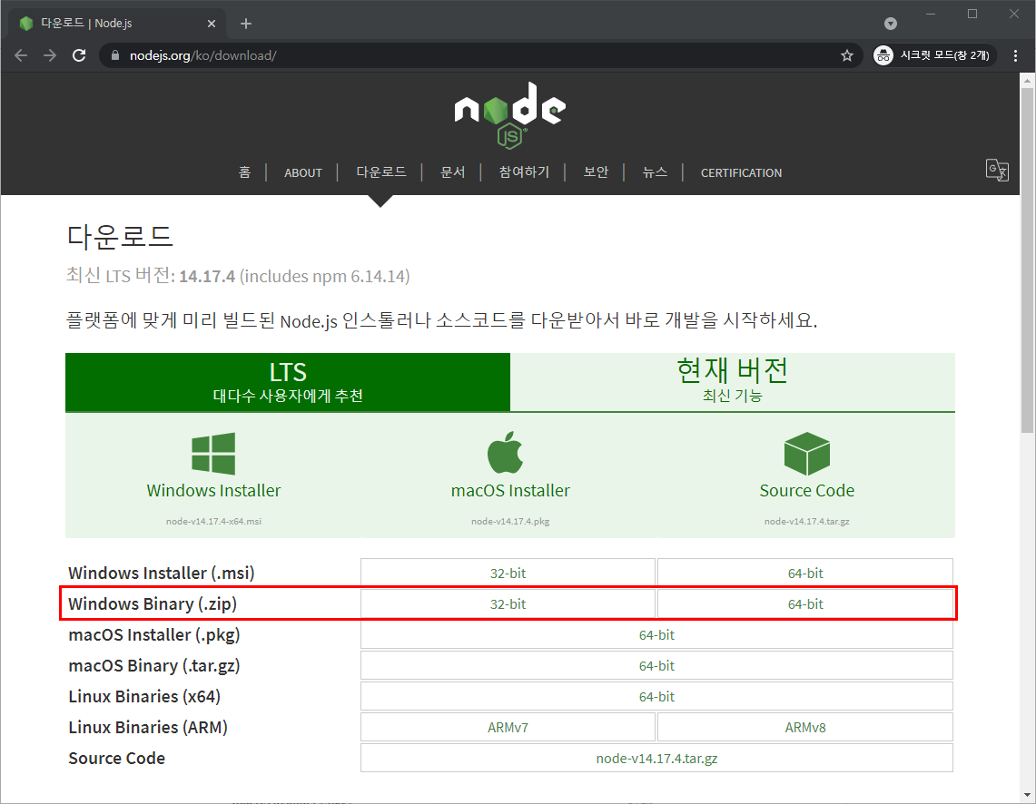 Node.js LTS 버전의 Windows Binary를 다운받아 압축을 푼다.