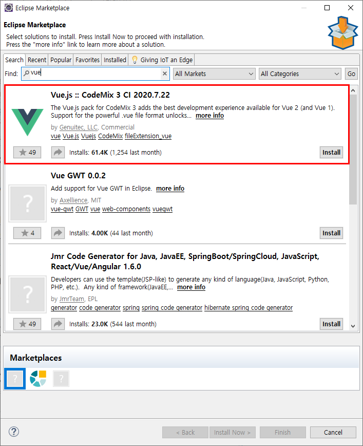이클립스>Help>Eclipse Marketplace...>vue를 검색해 코드믹스를 설치한다.