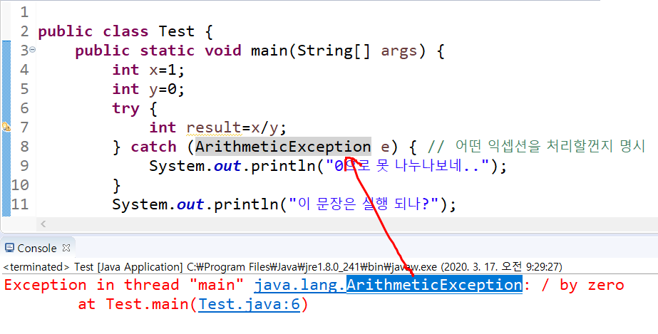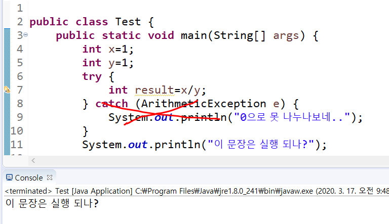자바는 오류가 나면 그 줄에서 바로 실행이 멈춘다.