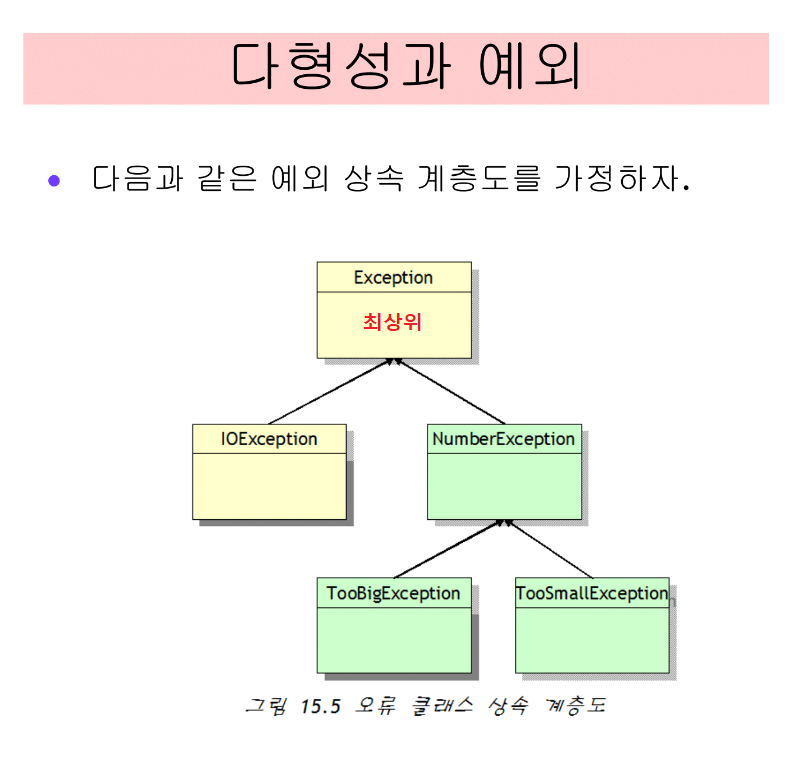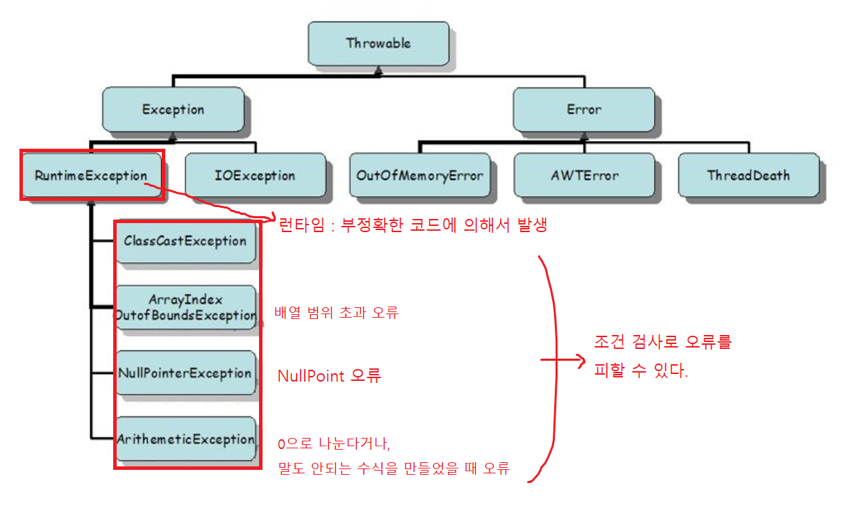 체크예외 => 컴파일러가 예외처리를 강요 ( IO 익셉션 같은 것 )