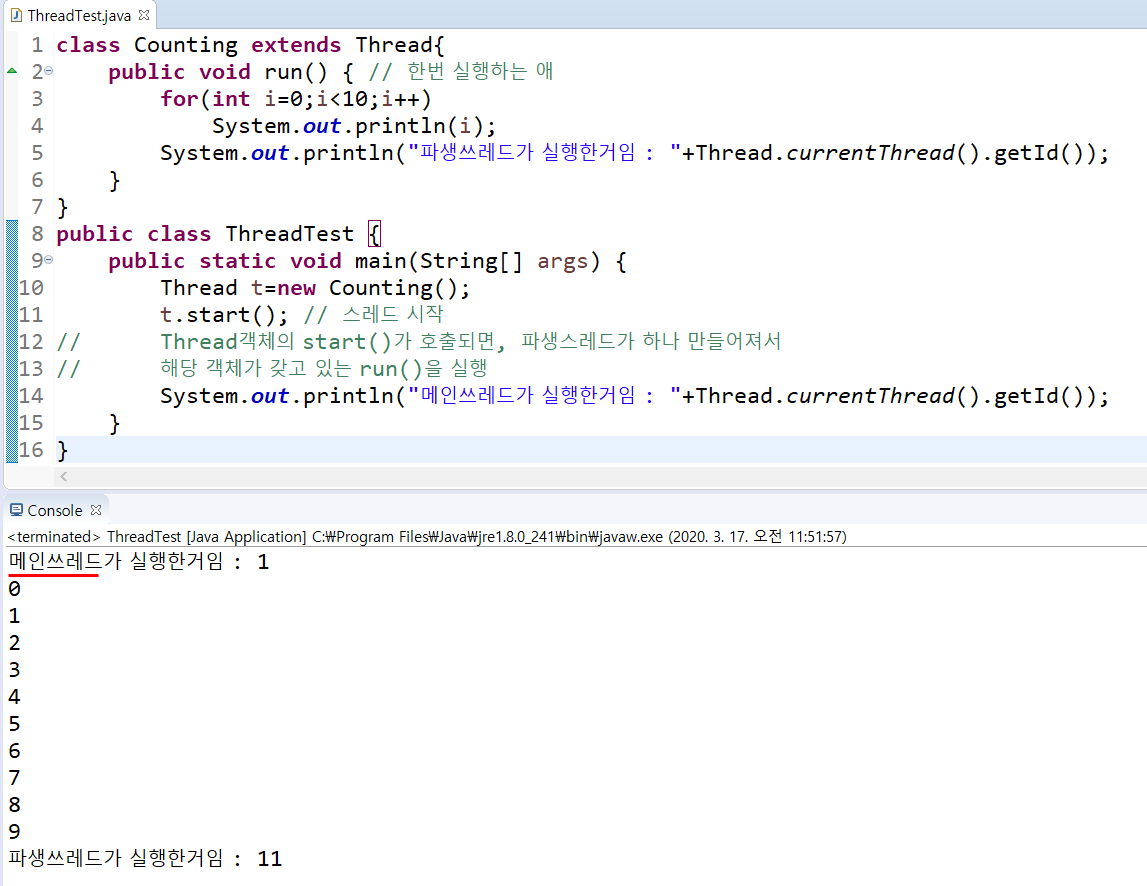 메인스레드가 동시에 start()다음의 코드들을 실행을 한다.