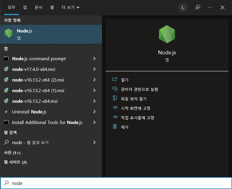 Node.js를 검색해 터미널을 실행하는 방법이 있다.