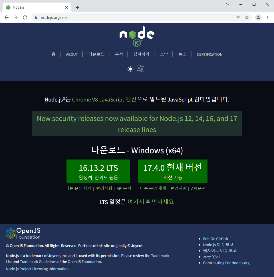 Node.js는 LTS와 현재 버전(Current) 두가지가 있는데 서버 운영이나 다른 프로그램과 같이 사용하여 안정성이 우선이라면 LTS, Node.js의 최신기능 사용이 목적이라면 Current를 받으면 된다.
