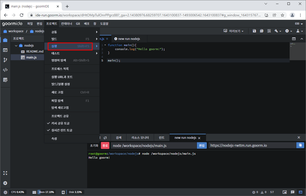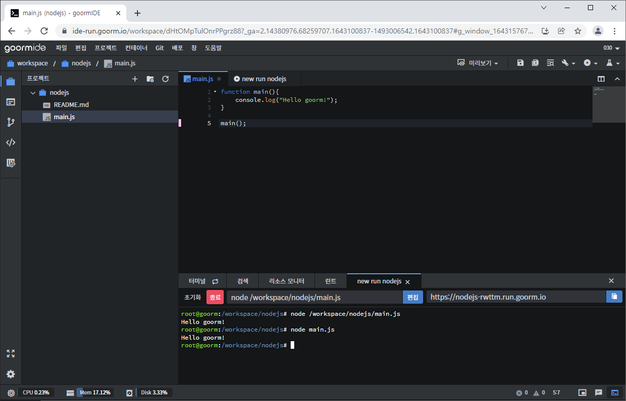 혹은 터미널 영역에서 "node 파일명"으로 실행도 가능하다.