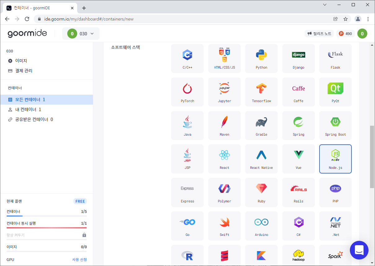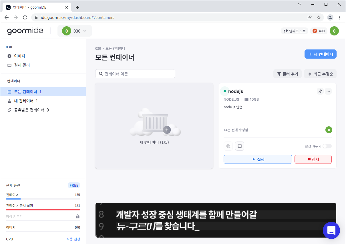 무료로 사용하기 위해 구름IDE에 가입하여 컨테이너를 만든다.