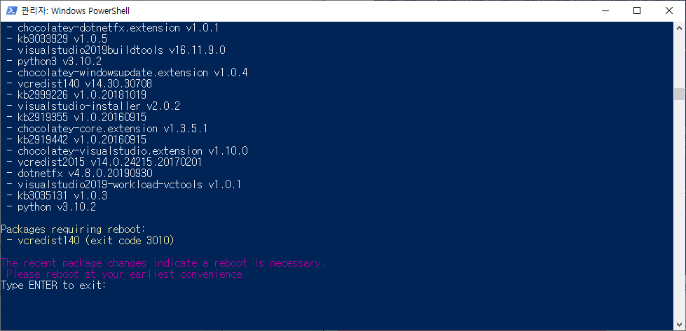 사용자 계정 컨트롤 창이 뜨고 ("예"를 클릭한다.) 파워쉘 창이 뜬다. 설치가 전부 끝나면 엔터키를 눌러 종료하면 끝.