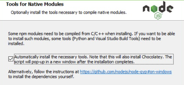 추가 도구 설치 체크시 Node.js 설치 완료 후 추가도구 설치 화면이 뜨고 아무키나 입력하면