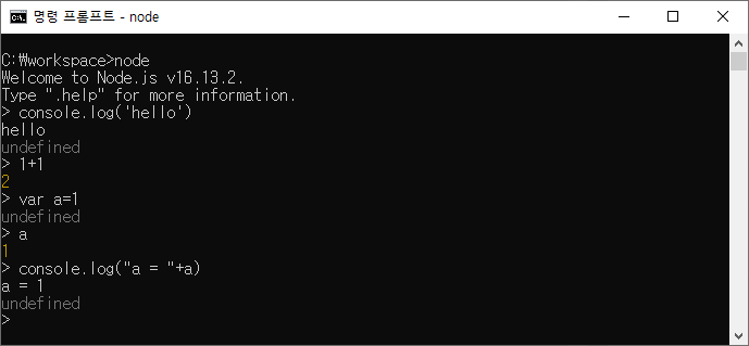 cmd 창에서 해당 워크스페이스로 이동해 node 파일명을 입력해 파일을 실행한다.