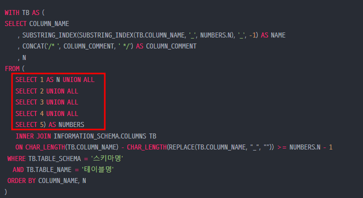 ON CHAR_LENGTH(TB.COLUMN_NAME) - CHAR_LENGTH(REPLACE(TB.COLUMN_NAME, "_", "")) >= NUMBERS.N - 1