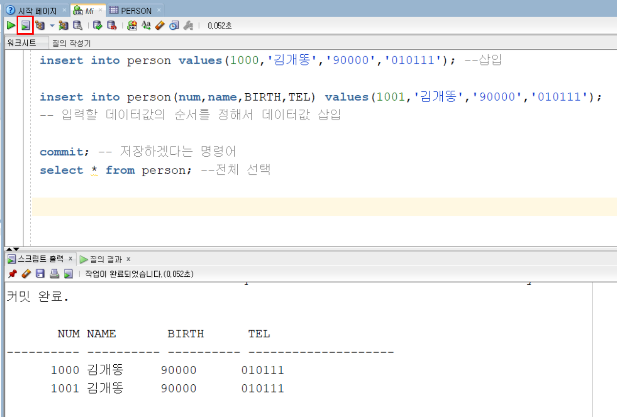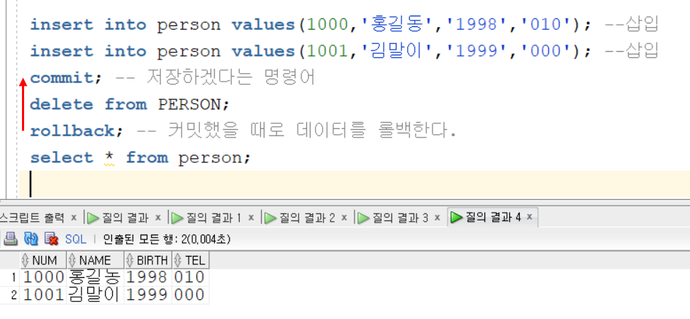 commit; => 데이터 영구 저장 (F11)