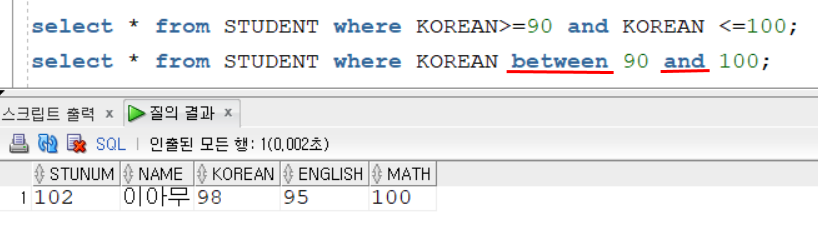 => 해당 컬럼의 데이터가 a~b사이