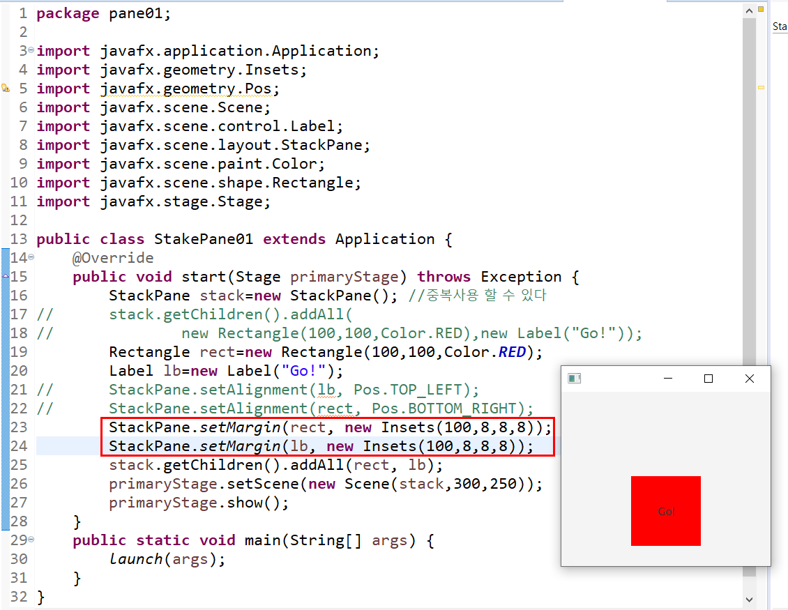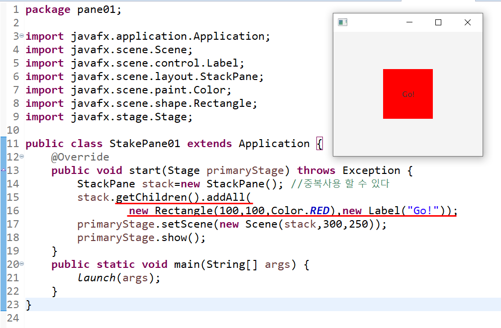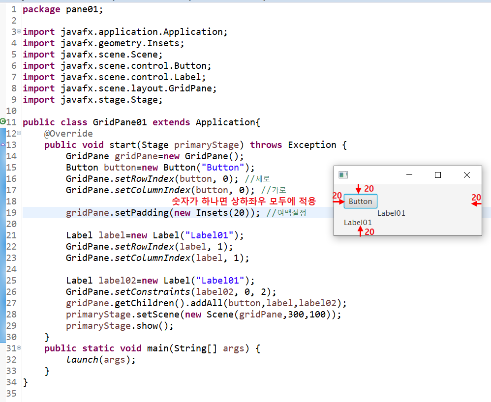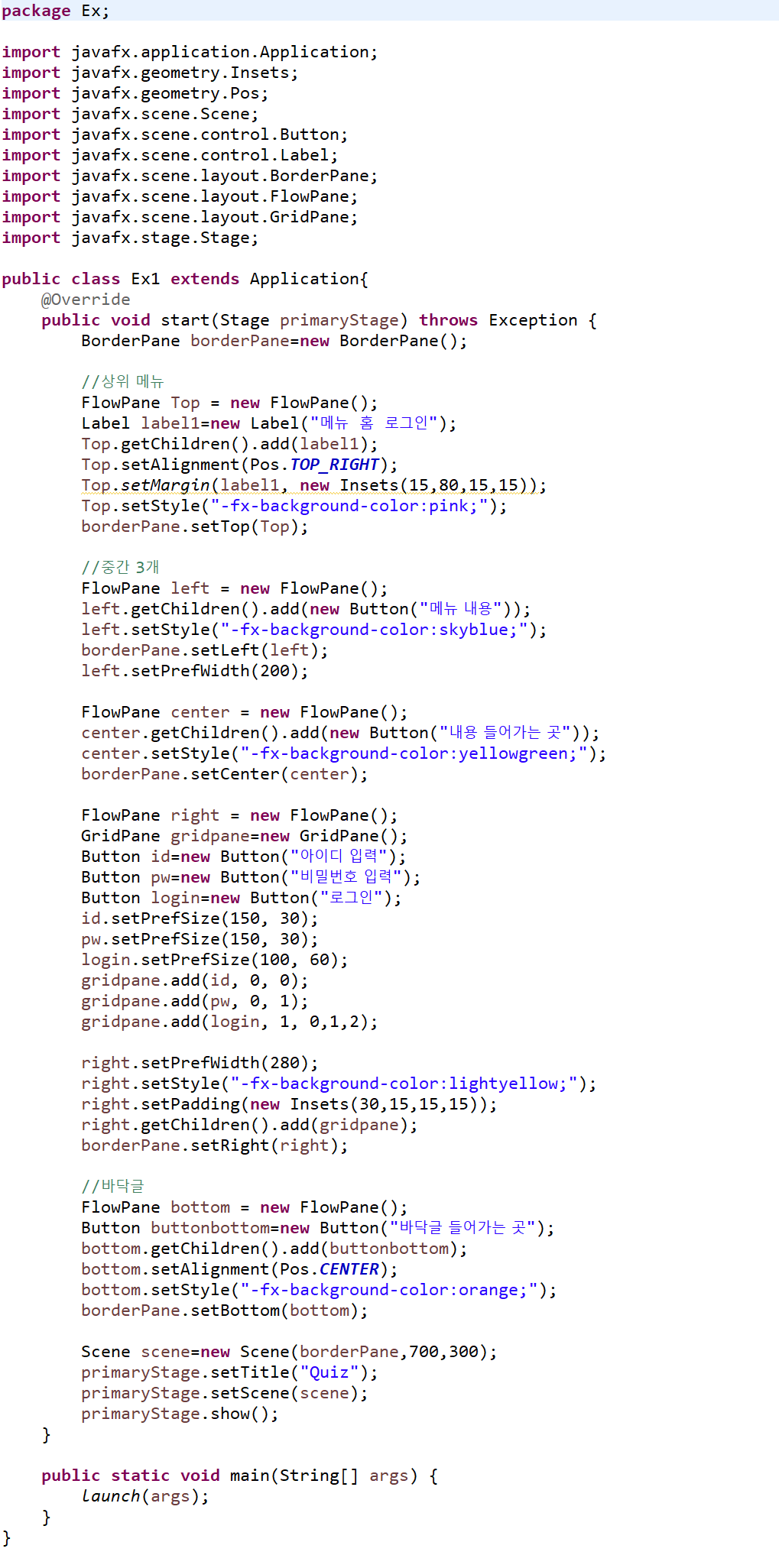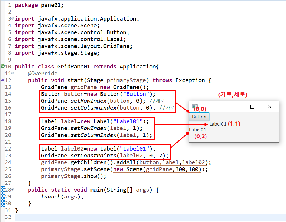 gridPane.add(pane, 가로, 세로, 가로병합, 세로병합) => 여러칸을 병합해서 그리드펜에 추가