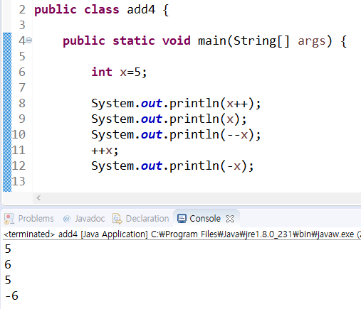 10번 라인 : x값에 -1을 한 데이터값 저장 후(x=5) 변한 x값 출력
