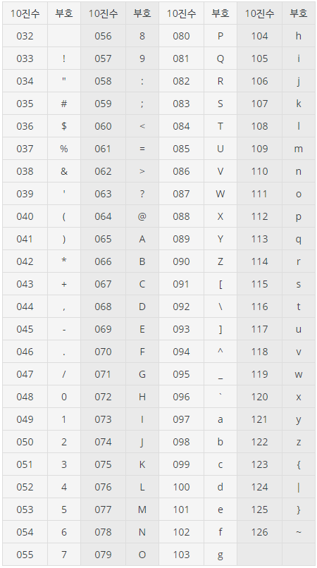 *아스키코드 : 영문 키보드로 입력할 수 있는 모든 기호들이 할당되어 있는 부호 체계