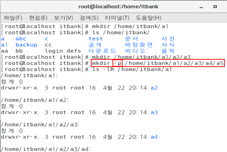 /home/itbank(사용자)/a1/a2/a3/a4/a5 디렉터리를 한번에 생성하시오.