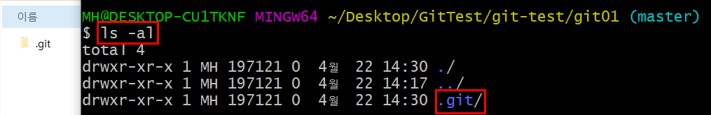 git init => git 숨김 폴더 생성
