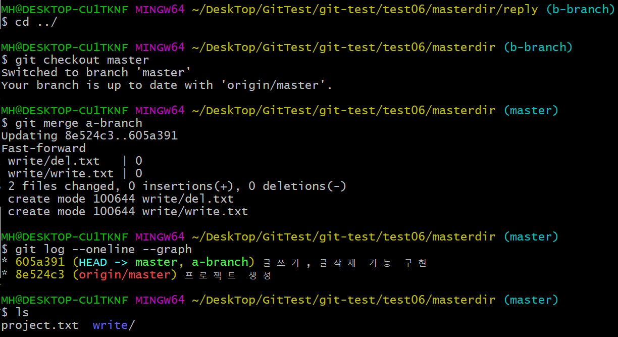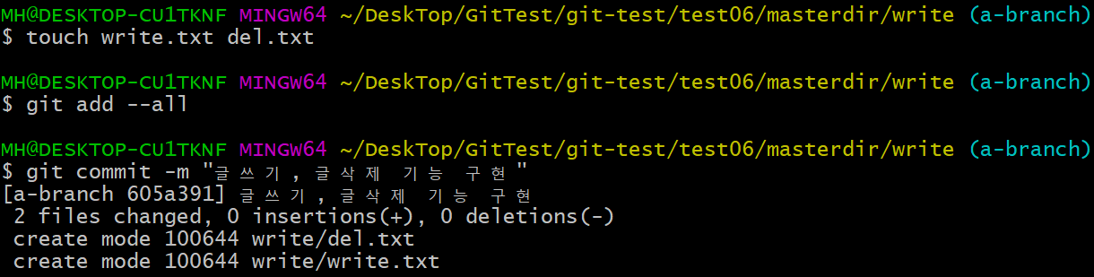 내용은 'a-branch에서 글쓰기, 삭제기능 구현',