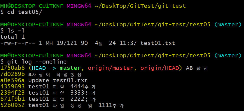 git pull을 해줌 => a사람이 작업한 내용 뒤에 b사람이 변경한 내용이 표시됨