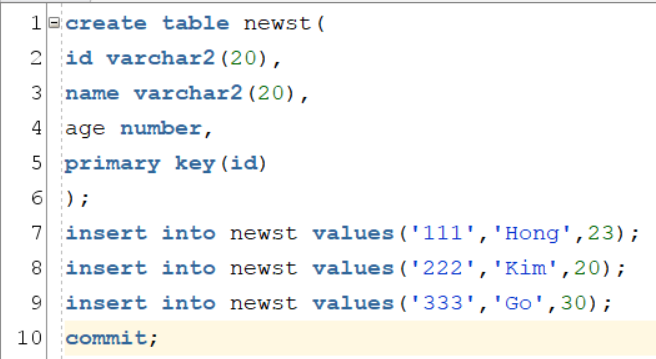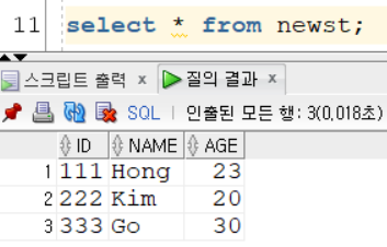 insert into newst values('222','Kim',20);