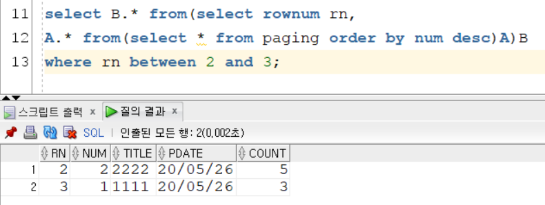 select B.* from(select rownum rn, A.* from(select * from paging order by num desc)A)B