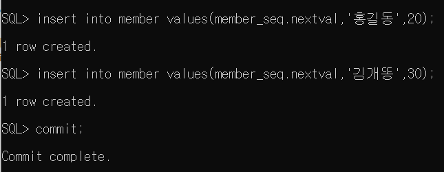 insert into member values(member_seq.nextval,'홍길동',20);